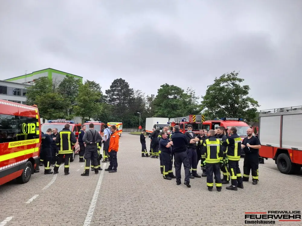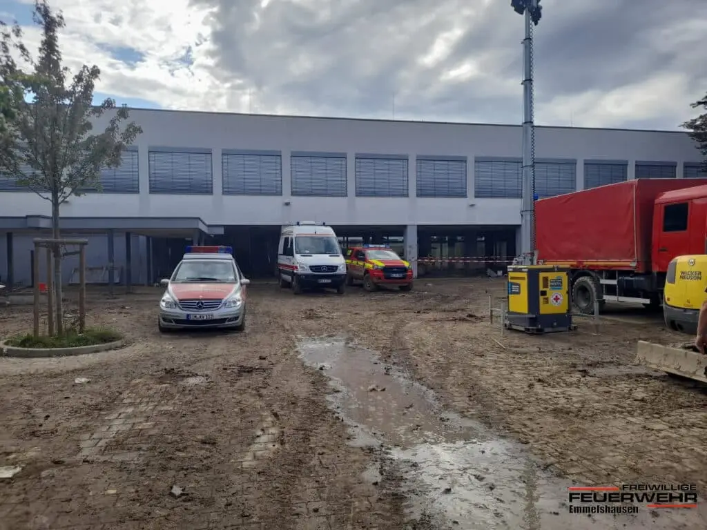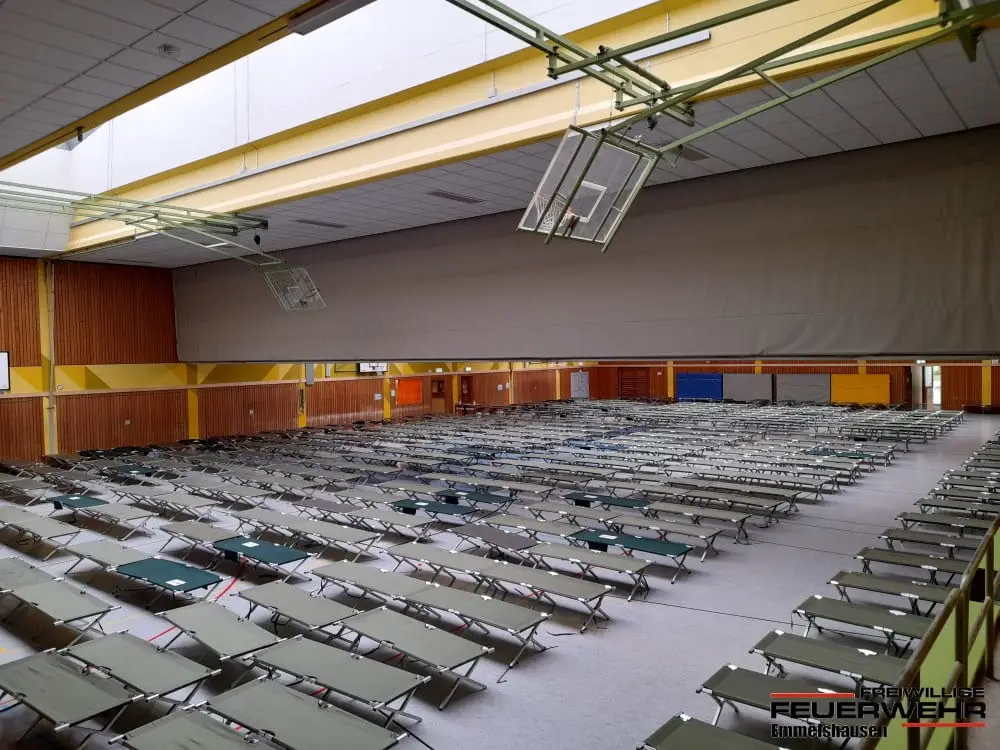 Noch wären der laufenden Spendenaktion wurden wir gemeinsam mit der Freiwilligen Feuerwehr Dörth und Gondershausen alarmiert, um in der Großsporthalle im Schulzentrum Emmelshausen eine Schlafmöglichkeit herzustellen. Diese Schlafmöglich soll für Einsatzkräfte dienen, die eine längere Anfahrt haben und auf dem Weg Richtung Ahrweiler sind. Mit Unterstützung des DRK KV Rhein-Hunsrück wurden ca. 300 Feldbetten in kürzester Zeit in der Turnhalle aufgebaut und dienten in der darauf folgenden Nacht Einheiten aus Thüringen und Baden-Württemberg als Schlafplatz.