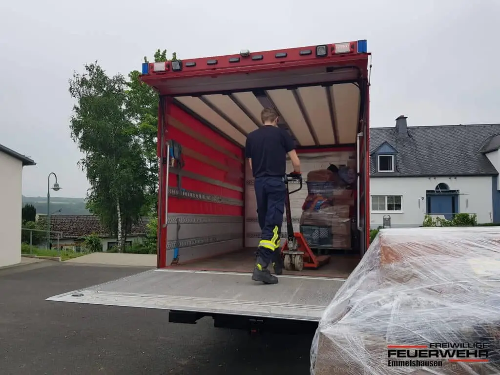 Nicht nur mit Einsatzkräfte unterstützen wir im Katastrophengebiet. Eine Spendenorganisation wurde organisiert und das Gerätehaus Emmelshausen wurde umfunktioniert zum Sammelplatz von zahlreichen Spenden aus der Umgebung. Die ganzen Spenden wurden von uns kontrolliert und auf Paletten gepackt. Insgesamt wurden 28 Paletten gepackt und im Anschluss transportiert.