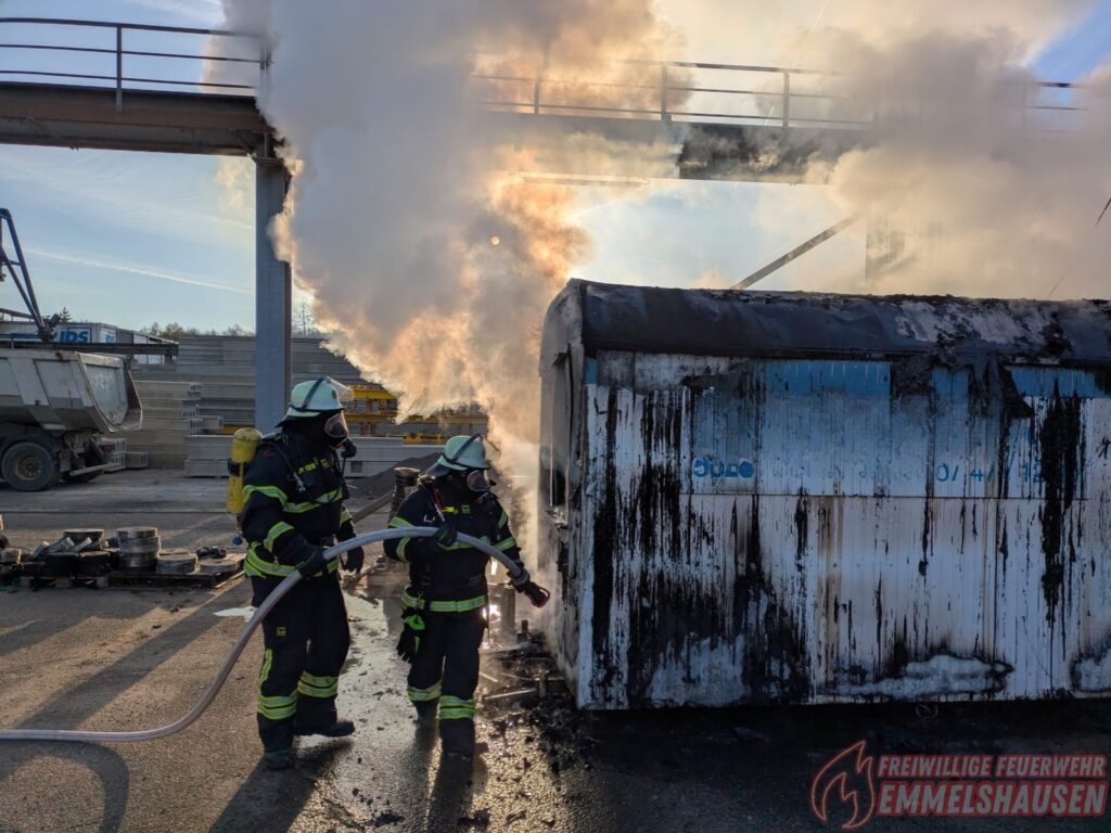 Bereits beim Eintreffen der ersten Einsatzkräfte stand der Bauwagen in Vollbrand. Durch den Einsatz mehrerer Trupps unter Atemschutz konnte das Feuer zügig gelöscht werden.