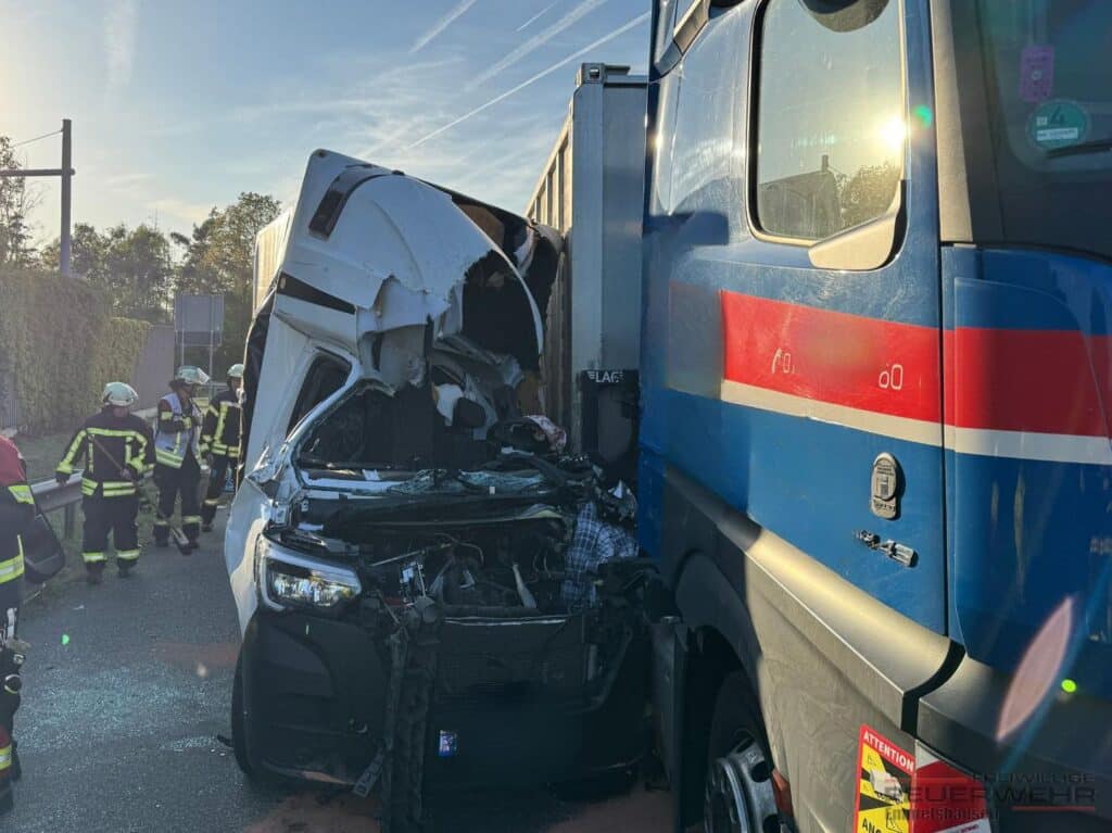 Ein Kleintransporter war aus noch ungeklรคrter Ursache auf einen anderen LKW aufgefahren. Dabei wurde der Fahrer des Kleintransporters eingeklemmt und musste durch hydraulisches Rettungsgerรคt befreit werden.