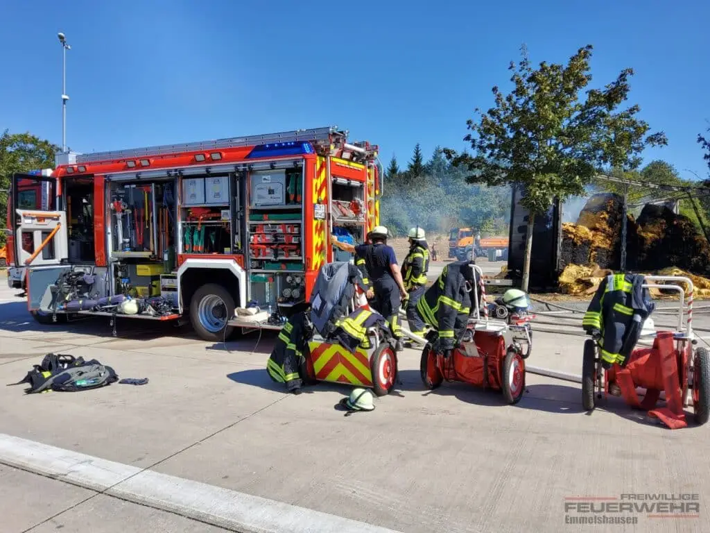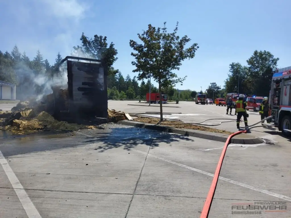 Am Mittwochvormittag wurde die Feuerwehr Emmelshausen gemeinsam mit der Feuerwehr Boppard-Buchholz zu einem LKW-Brand auf den Rastplatz Hellerwald alarmiert. Vor Ort stellte sich heraus, dass ein LKW-Anhänger, beladen mit gepressten Tabakblättern in Vollbrand stand. Zur Unterstützung wurde zusätzlich die Feuerwehr Pfalzfeld nachalarmiert.