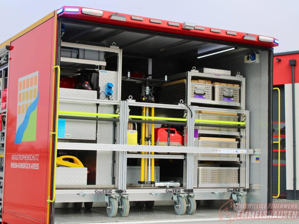 Das Fahrzeug ist mit einem modularen Rollcontainersystem ausgestattet, von dem insgesamt drei Rollcontainer verladen sind. Dadurch kann die Ausrüstung je nach Einsatzlage flexibel entnommen und eingesetzt werden.