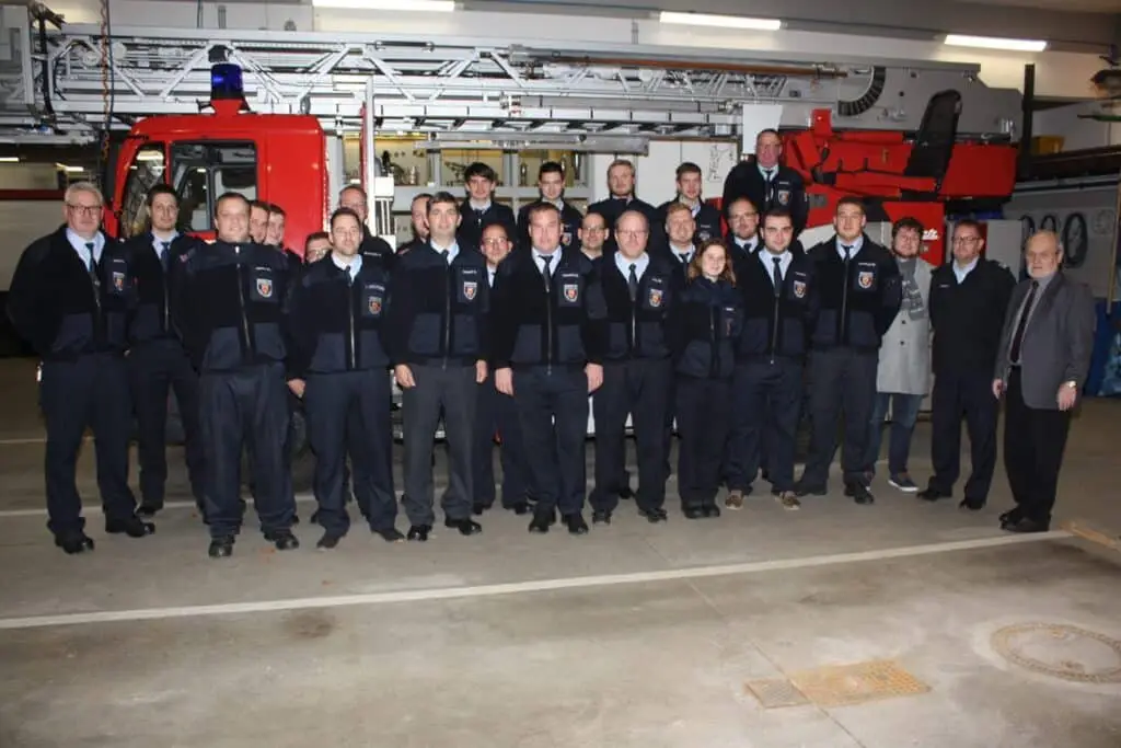 Foto: Die Aktiven der Feuerwehr Emmelshausen mit Michael Kneip (vorne 3. von links), Michael Horzella (vorne 6. von links), dem Wehrführer Daniel Dötsch (vorne 5. von links), dem Wehrleiter Klaus Eiskirch (2. von rechts) und dem 1. Beigeordneten Karl Moog ( ganz rechts)
