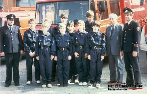 Die Jugendfeuerwehr Emmelshausen am Tag ihrer Gründung mit Jugendwart Alfred Gras (1v.l.) Wehrführer Herbert Lück (1.v.r) sowie Bürgermeister Willi Link (2.v.r.)