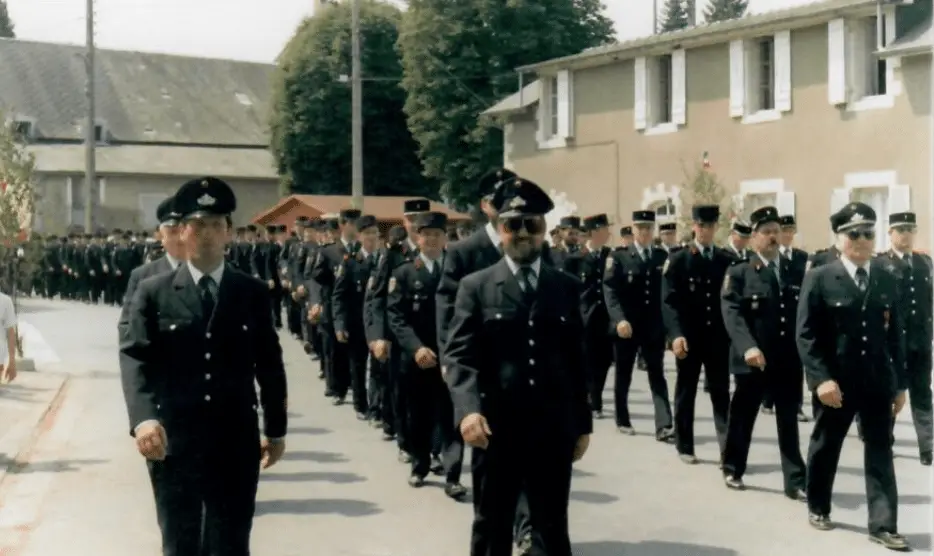 Kameraden der Freiwilligen Feuerwehr Emmelshausen bei einer Parade in Luzy mit französischen Kameraden